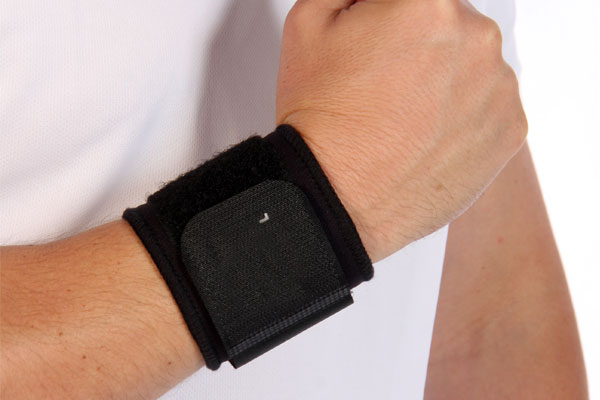 Muñequera confeccionada en neopreno, modelo envolvente que se ajusta con un velcro.